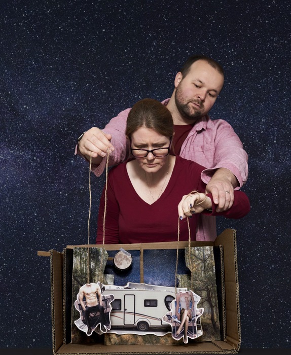 Tonight, I entered the intimate studio to a scene that showed a messy area of clothes, tippled-over chairs and strewn bottles of water. A couple were in the space looking frantic and tense and the woman was constantly checking her phone. The couple were arguing about whether the show should go ahead as the main female cast member had not attended.  The man stated that the female had to step in and although she initially refused, she played the second cast member. The female cast member Helen Millington, (who directed the play) under duress, agrees to play the part of Crystal (a sex worker) – and as the music of the House Martins “Caravan of love” wanes after playing on a loop, the play commences.  The male cast member played by Helen’s real life husband Alexander (who wrote the play) , explains to the small audience the plays’ plot.