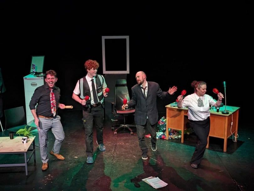 Director Dan Meigh’s re-imagination of the play places us in a modern-day police station where a mysterious Maniac (Mat Oliphant) has just climbed through the wrong window to be encountered by Inspector Berlozzo (Phil Rayner) and Constable 1 (Noah Cambridge) who are already in possession of a warrant for his arrest. With a history tied to disruption and disturbance across the ages, the Maniac makes his escape to the fourth floor and an encounter with a Chief Inspector (Eleanor Martin), Inspector Pisoni (Connor Wray), and Constable 2 (Cambridge).