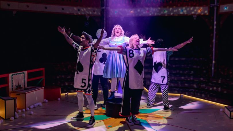 A fabulous theatre, a story of marvel and magic, at a pantomime time of year and excitement in bucket loads, this being the ingredients to the opening night for the journey into fantasy, written with brilliance by Nick Land and directed with creativity by Nathan Powell that greeted the packed theatre this evening. To greet the full house, there were children dancing in the foyer and magical colour-changing potions to add to orange juice with the famous quote from the book itself ‘drink me’ (now pour me), that had us all entwined in the world of Lewis Carroll from the onset.