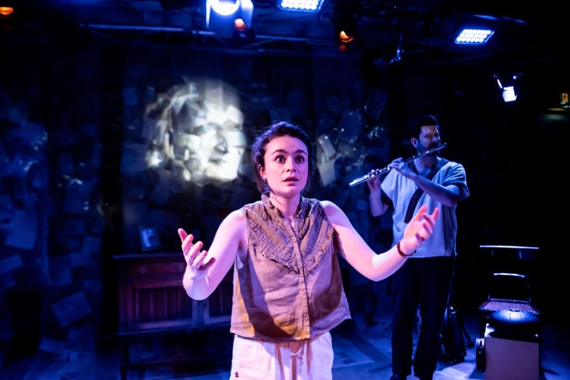 Freedman is played by two actresses who occupy the stage simultaneously, sharing the narrative, bouncing the events off each other; “Miriam,” her later-in-life manifestation, is played Caroline Gruber, whereas Zoe Goriely takes on the mantle of Freedman’s younger adult and child manifestations, the latter called “Eva.” Both performances are fantastic: Gruber shares Freedman’s experiences with an evocative vulnerability, tempered with seriousness and humour, and generously attends to the trials and tribulations of her younger self; Goriely, meanwhile, deftly balances moments of great physicality (Running! Leaping! Dancing!) and great emotional intensity (the anguishes of a child surviving the unthinkable) with intention and subtlety. Both are affecting and artful. Goriely’s embodiment of the range of stages of Freedman’s young life is particularly notable. One final performer, Matthew James Hinchliffe, offers musical accompaniment and reflects the presence of some minor characters, neatly augmenting the world and experience of the play while never taking away from our leads.