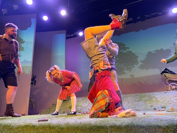 As we enter the theatre, the stage is presented with grass and woodland debris and as the play begins, our first impressions are of a young boy called Willie (Simeon Green), playing army in the woods, using a stick as a pretend gun and as he hears the sound of a plane flying overhead, he falls down playing dead.  A stark reminder that Willie understands war, even though he is only seven.  He is soon joined by his friend Peter (Robin Jackson), the bully who tries to lead his friends astray with his ideas of naughtiness in his quest for jam jar empties to take back to the shop for money, killing squirrels and, has anyone got any matches?  Poor Raymond (Michael Schenck) seems to be more sensitive than the other boys, dressed in his cowboy outfit and carrying his toy gun, his stutter makes him the butt of jokes.  The two girls Angela (Louise Colohan), and Audrey (Niamh Brazier) are typical girls of the 1940’s, playing house, pushing their dolls pram, and planning who they are going to marry when they grow up.