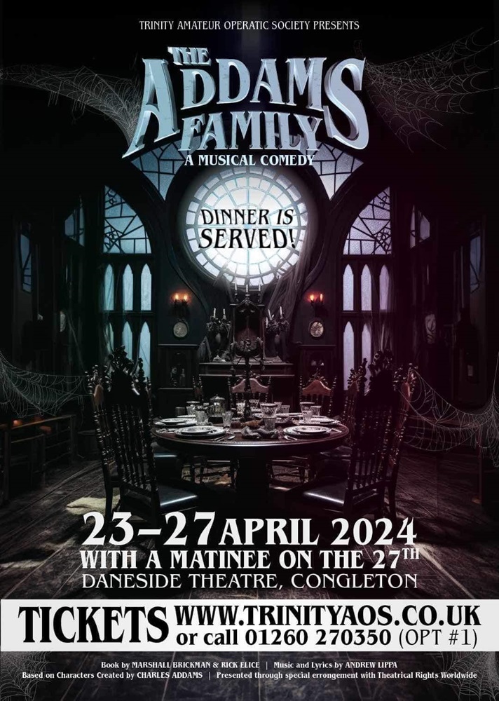 Rehearsals are coming to a close in Congleton this week at Trinity Amateur Operatic Society before the cast and crew of The Addams Family move into the Daneside Theatre ahead of opening night on the 23rd April. Running until 27th April at 7:30pm with a 2pm matinee on the 27th.