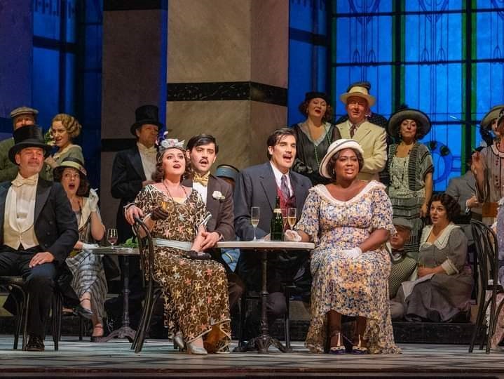 Opening to the backdrop of Ezio Frigerio’s rich and sumptuous set, matched by Franca Squarciapino’s costumes and elegantly lit by Duane Schuler, we meet Magda (Angel Blue), the mistress of a wealthy banker, Rambaldo (Alfred Walker), but when the poet Prunier (Bekhzod Davronov) reads her palm and predicts that la rondine – the swallow – she will travel south in her pursuit of happiness, the die is cast for what is to follow. When she meets the young Ruggero (Jonathan Tetelman), glamour soon turns to decadence as she follows him to the nightclub Bulliers where they fall in love and decide to run away to the south of France, and with Prunier equally smitten with Magda’s maid, Lisette (Emily Pogorelc), the two couples find themselves heading in a similar direction too.