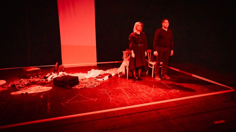 Then, suitcases in hand, the cast emerge onto a near bare stage, adorned with nothing more than a handful of chairs, a square of barrier tape and two rows of hanging theatre costumes.