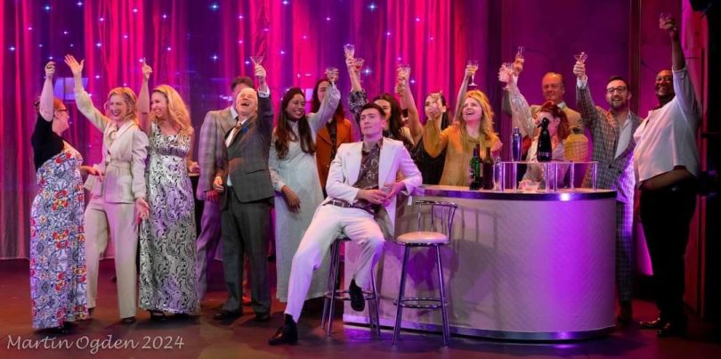 The leading trio were all well cast and demonstrated the necessary chemistry to convince, all starting from unsympathetic premises they gradually peeled back the cynicism to reveal the underlying love and shared experiences of their lives. Tom Broughton brought assuredness to the central role of Franklin Shepard, more convincing in the younger iteration as the show progressed, he was the pivot around which more demonstrative performances orbited. At the other end of the experience scale and making a fabulous debut at Altrincham Garrick, Luke Disley gave Charlie a beautiful downtrodden everyman character at the outset (think Amos in Chicago), before bursting with manic musical energy during his breakdown live on television (Franklin Shepard Inc). However, as strong as the cast was, it was Meg Brassington who blazed through the evening like Sputnik across the heavens, from her first appearance, drunk and cynical and defeated, through her unrequited love for Franklin, all the way through to her initial meeting with her friends at the end/beginning, all facets of the character were fully realised. Real pathos combined with comedy is a difficult balance to achieve and Meg carried it off sumptuously, from the knockabout of ‘Old Friends’ to the pure comedy of ‘Bobby and Jackie and Jack’s cumulating in the emotion of ‘Not a Day Goes By’, this was a superb performance.