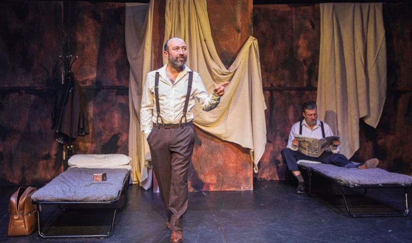 Gus (Gareth Llewelyn) and Ben (Richard Cottier) are hit men who are holed-up in a dingy basement kitchen, waiting to be sent out on their next job. Even from before the start of the play it is clear that Ben is the more senior of the two as they lie on their respective beds – Ben reading the newspaper, Gus seemingly asleep.