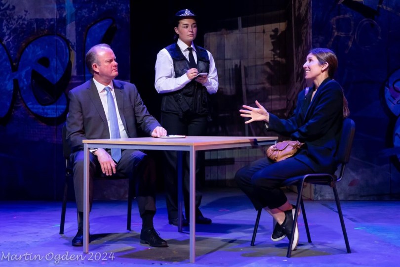 Scarlet Newton as Megan Hipwell was mesmerising. Newton’s moving monologue revealing how Megan’s baby died had the audience gripped. Newton gauged this just right, the perfect level of emotion making this scene wholly believable, heart-rending and appropriately unsettling. Loui Quelcutti (Scott Hipwell) conveyed the two sides of Scott well, varying between loving husband and jealous, angry aggressor placing himself firmly as another key suspect in this gritty whodunnit.