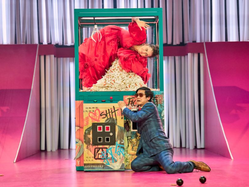 The world of the play is brilliantly and complexly articulated using Brecht’s principles of alienation but tearing its naturalistic feel entirely, reducing the didactic impact. The city of Szechwan, boldly designed by Georgia Lowe resembles an animated video game with a hot-pink stage surrounded by two slides on either end and a black pathway on the edge of the stage, probably a polluted river filled with black softballs. The centre stage is occupied diversely, first by a giant paddling pool with plastic bottles, then a giant claw machine with cigarettes (Shen Te’s tobacco shop) and later by a giant cigarette (Shui Ta’s tobacco factor). As the corruption increases, the set grows from small to big, poor to rich, and moral to immoral. The stage is flanked by long cylindrical white tubes which produce light to support scene changes, later transforming into cigarette butts. Further, the archetypal characters with symbolic costuming, karaoke music by DJ Walde portraying the manipulative internal contrivances of characters, flashy light design by Jessica Hung Han Yun, the occasional appearance of full-sized rat and frog, and balls swung at audiences, all ensure that the viewers are neither fully indulging nor fully disengaging from the play, successfully producing Brecht’s alienation effect.
