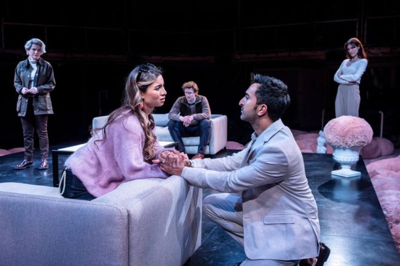 Director Josh Roche and Designer Eleanor Bull initially present us with a stunning visual treat, the set taking its inspiration from the floral displays in a plethora of shops and coffee houses that infest our modern world. Suspended from the ceiling an enormous imitation flower display acts to illustrate the fake nature of the world the characters inhabit, with the raised stage populated by the large sofas and the detritus of too many Deliveroo orders surrounded by a sea of ‘Millennial Pink’ marshmallow cushions, summoning to mind an adult version of a kid’s soft play area. Into this tactile and fantastical set we drop Algernon (Parth Thakerar), suffused with the ennui of his generation, resorting to teasing his friend Jack (Robin Morrissey) and creating a double life of ‘Bunburrying’ to entertain himself in a world where materialism and image rule.