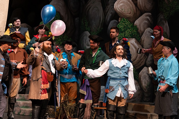 Another issue was one of volume. The decision seems to have been taken to amplify the cast with floor mics, resulting in the opposite result as several vocal performers were drowned out by the noise of their own feet. Thanks to that and the occasional speakers’ bursts of hum and feedback, it eventually dawned on the audience that the mysterious background creak of rigging from the absent pirate ship must actually be coming from the performers’ feet on the floorboards. The unfortunate outcome of this attempt was that some performers were not only still difficult to hear but were now facing added competition from their fellow cast-members shoes. These technical issues might be excusable, if not understandable, in a visiting production, but seem quite baffling considering the company is local and has a decades-long relationship with the venue.