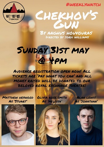 Up ‘ere Productions are currently holding a Weekly Watch on Zoom to keep theatre alive during the COVID-19 crisis. This week’s offering was two new short plays, Chekhov’s Gun by Anghus Houvouras and Where the Time Went by Jim Spencer Broadbent, both directed by Jordi Williams and linked by themes of mental health issues and the overwhelming feeling of reaching the end of your tether.